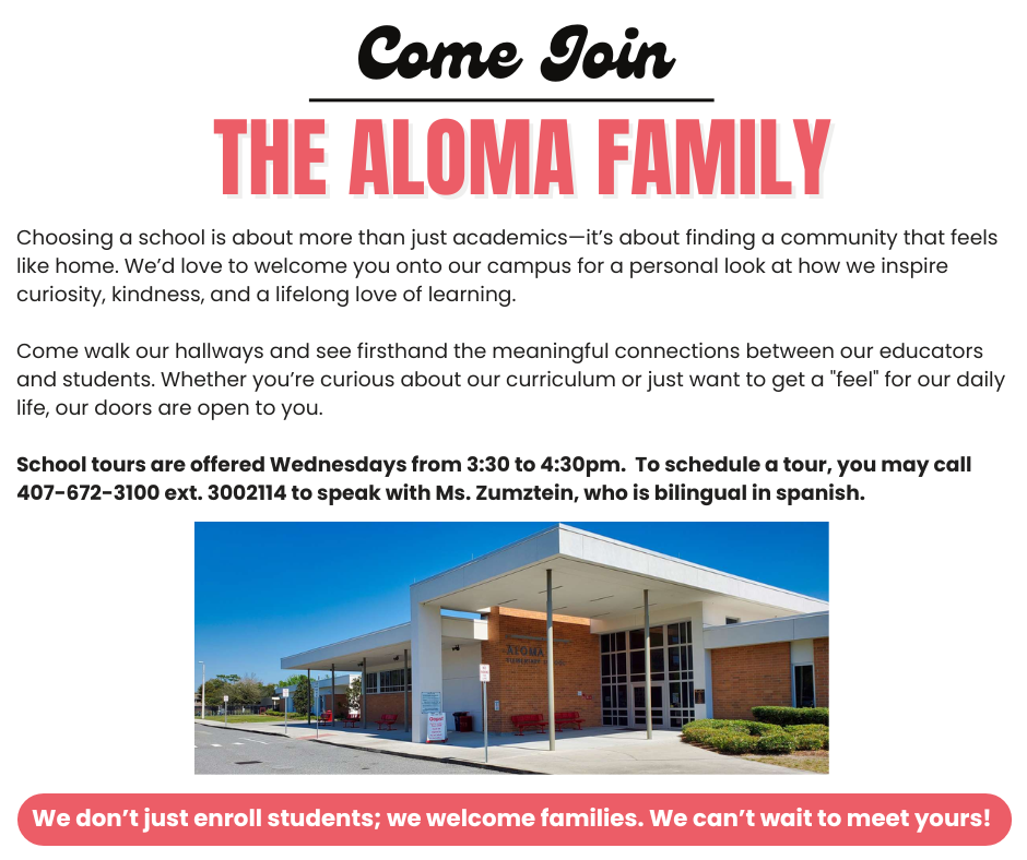 We are thrilled to to welcome you to another exciting school year at Aloma Elementary. This year, we are proud to celebrate a major achievement: our school grade has risen from a C to a B! This reflects the dedication, resilience, and hard work of our students, staff, and families. Together, we are showing that every student can learn and succeed.